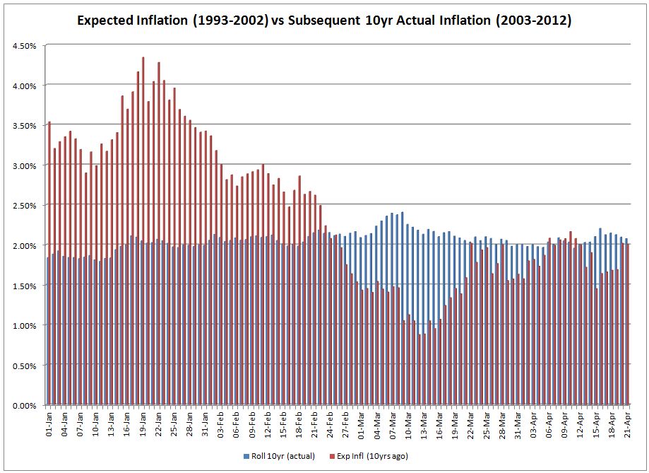While this is as a good an estimate as any, it also hasn’t been terribly accurate. The chart below shows how the inflation rate embedded into Canadian bond prices (i.e. inferring inflation from long Canada bonds and Real Return Bonds) at a point in time compares with actual inflation over the subsequent decade.