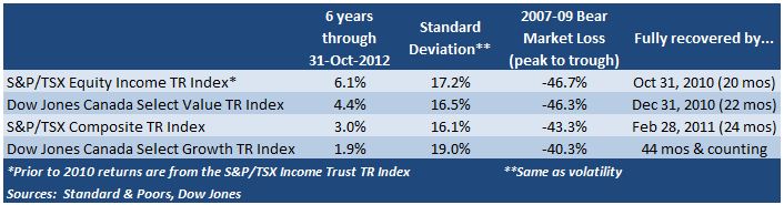 In the six years since the announcement, we can gauge the performance of this market segment by linking the old S&P/TSX Income Trust Total Return Index and the current S&P/TSX Equity Income Total Return Index. That combo saw returns of about 6% per year for the six years through October 31, 2012. By comparison, dividend stocks (measured by the Dow Jones Select Dividend Index) rose by 4% per year. The S&P/TSX Composite Total Return Index – the broader Canadian stock benchmark – saw returns of about half of trust returns.
