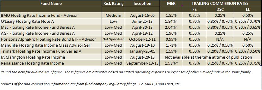 Each fund’s prospectus and Fund Facts disclosure document contain a risk rating. The table below shows a summary of the existing group of FRN funds along with associated risk ratings and trailing commission rates. (Click on the below table to enlarge it.)